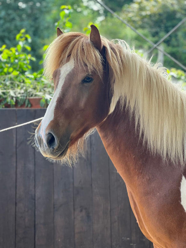 Balthasar hat 2022 bei uns einmal gedeckt bevor er im Herbst des gleichen Jahres kastriert wurde. Seine Tochter Frigg wächst bei uns auf. Er selbst ist, wie all unsere Pferde, artgerecht in unserer Jung"hengst"herde aufgewachsen.